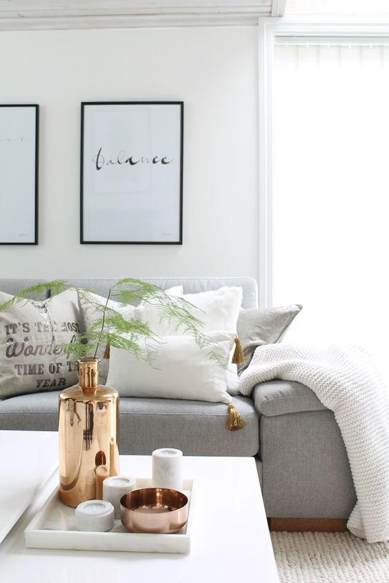 ? ? ? ?灰色作為中間色,為了不使空間變得沉悶單調,需要在灰色空間里加入一些能夠點亮空間的東西。靠枕顏色、地毯、框畫等往往會作為灰色空間的視覺中心,黃銅元素的家具一樣也可以,燈具、花器、茶幾都能夠幫助點亮空間。