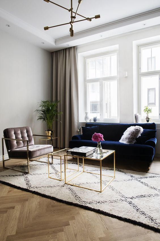 ? ? ? ?天鵝絨材質的沙發搭配黃銅小細腿茶幾,明亮的黃銅色增加了空間的優雅時髦感。