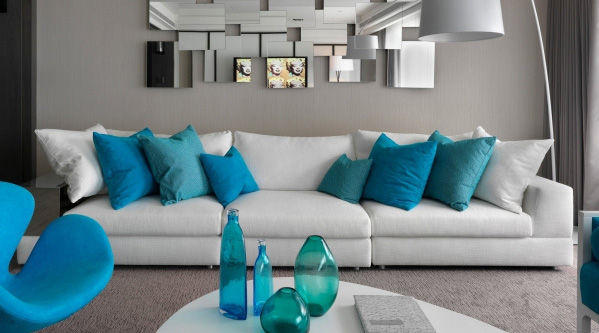 ? ? ? ? “遠(yuǎn)大近小”,是指越靠近沙發(fā)中部,擺放的抱枕應(yīng)越小,視覺上給人的感覺會(huì)更舒適。