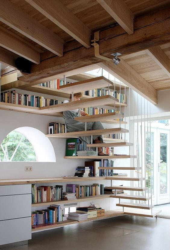 沿著樓梯設(shè)計(jì)書架是很多書店會(huì)用到的創(chuàng)意,現(xiàn)在你可以把這個(gè)創(chuàng)意搬到自己家,想看書的時(shí)候隨時(shí)坐下來,是不是超方便~