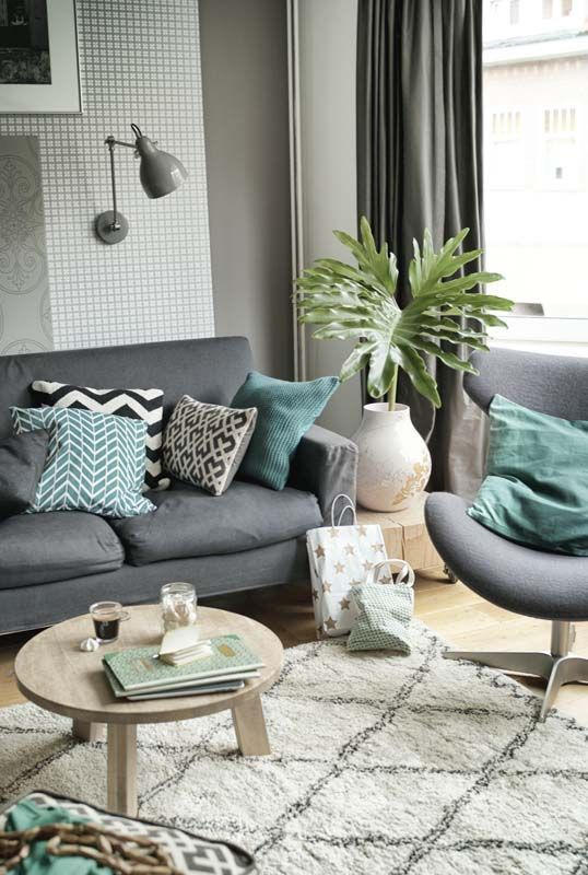 窗簾與壁紙同色系,搭配室內綠植、抱枕共同構成了一個藍綠色系的冷調空間,色彩之間十分和諧。