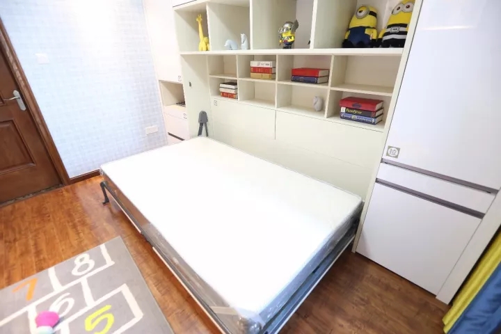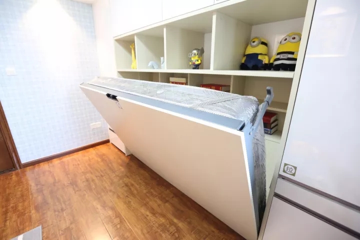 臥室的方寸空間,最重要的是合理利用每個區域,除了固定空間之外,還可利用衣柜和床板。衣柜中間做儲物格,分離長短衣的同時,格子同時起到了裝飾作用。兒童房可以使用翻板床,白天可以給小朋友留出一個自娛自樂的小天地,晚上拉下成床。