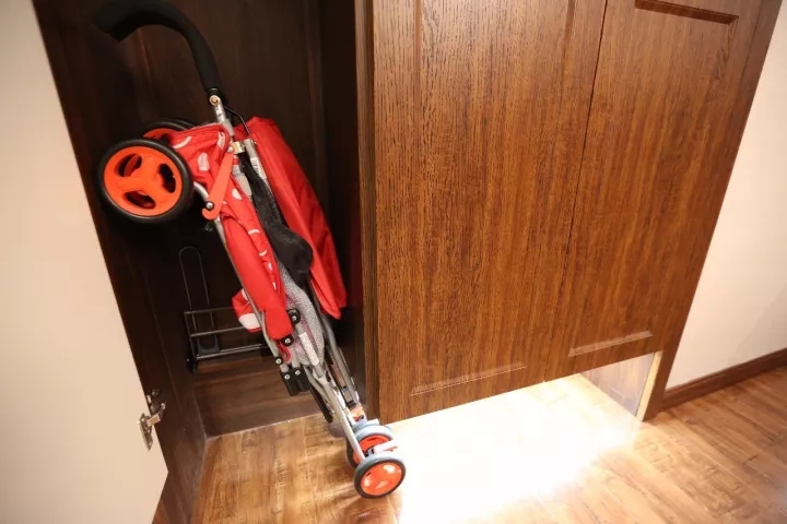 放下來可以放置雨靴/長(zhǎng)靴,拉上去可以放置嬰兒車。