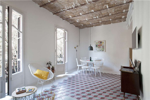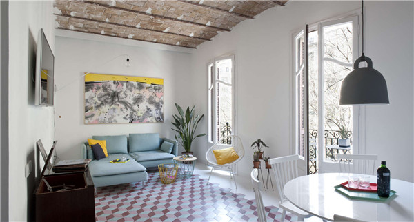 以不著一色的白墻面與材質(zhì)裸露的屋頂演繹北歐純粹、自然的精髓,表達(dá)出簡(jiǎn)約、干凈的設(shè)計(jì)觀。淡藍(lán)色的雙人沙發(fā)、經(jīng)典的三色拼接花紋地磚與隨意點(diǎn)綴的亮黃色,構(gòu)成客廳基礎(chǔ)色,讓這個(gè)空間有了家的溫度。