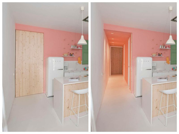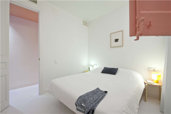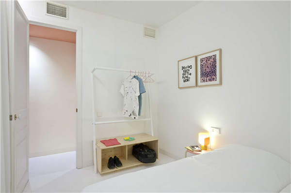 從進(jìn)入臥室開(kāi)始,溫馨甜美風(fēng)更濃。由于走廊相對(duì)狹窄封閉,受到北歐風(fēng)格一貫的影響,若不加修飾,從一進(jìn)門(mén)就會(huì)覺(jué)得壓抑蒼白,因而設(shè)計(jì)師特意以大面積的粉色系填充,醞釀出夢(mèng)幻浪漫的氛圍。