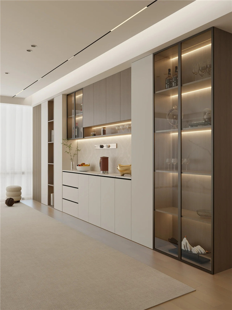 家中適當(dāng)留有一些開放格,可增加層次感與時(shí)尚度,但千萬(wàn)不要做滿墻開放格,等到后期清理積灰的時(shí)候,后悔也晚矣。其實(shí),玻璃柜門與實(shí)木柜門組合,就是非常高級(jí)的搭配。