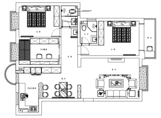 陸景苑的這套138㎡的三居室住宅為朝西戶型,整體的結(jié)構(gòu)四四方方且沒有犄角,最大的問題在于不夠通風(fēng)透氣,且陽光難以進(jìn)入室內(nèi)。因此設(shè)計師在進(jìn)行規(guī)劃設(shè)計的時候,很大程度上保留了原來的戶型功能結(jié)構(gòu),同時將各個功能區(qū)域的窗戶進(jìn)行擴大處理,有的直接改造為落地窗,以提升室內(nèi)采光、通風(fēng)效果。