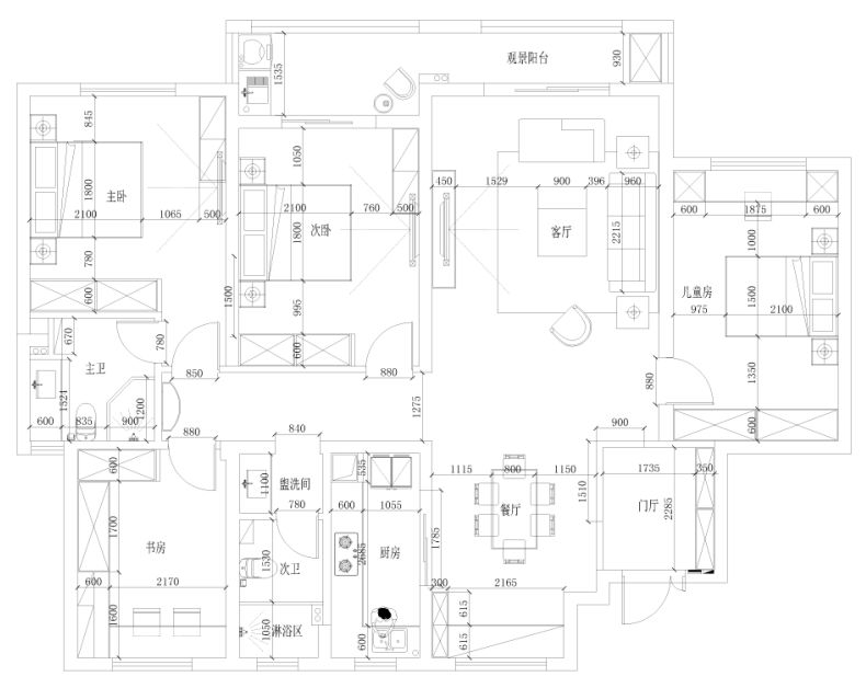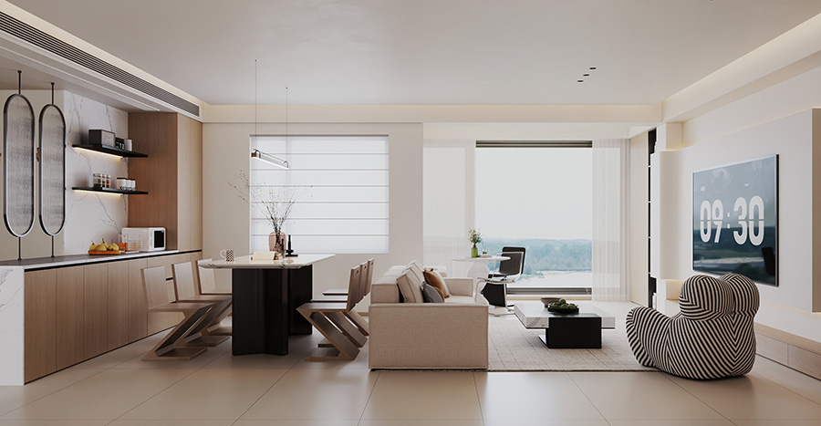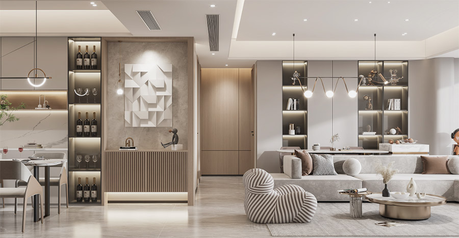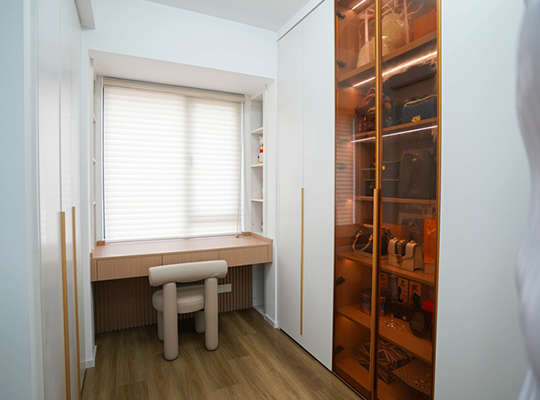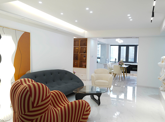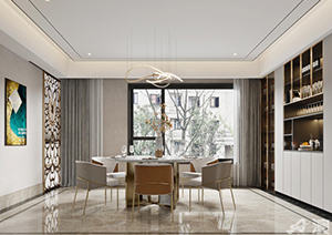 復(fù)地東湖國際這套170㎡的四居室住宅戶型相對比較平整方正,而由于入戶門在房屋偏角處,因此設(shè)計師在進行規(guī)劃設(shè)計時就利用入戶門軸向作一個劃分,將作伴區(qū)域作為業(yè)主的辦公、休憩區(qū)域、中間則設(shè)置為會客區(qū)域,右邊則打造為兒童房,有效提升了各個功能區(qū)域的劃分。