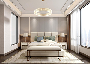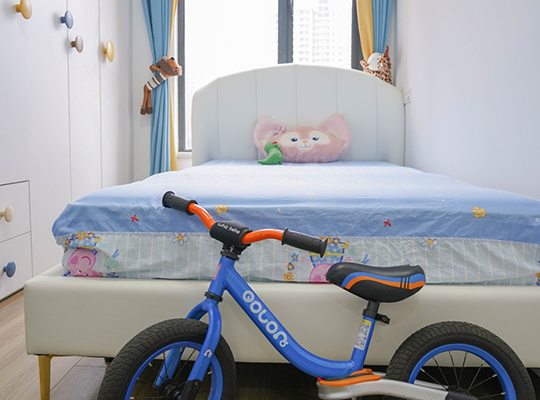 臥室區(qū)域使用了大面積的淺色作為主基調(diào)色,營造溫馨柔和氛圍,而撞色的床具則讓整個臥室更具個性感。