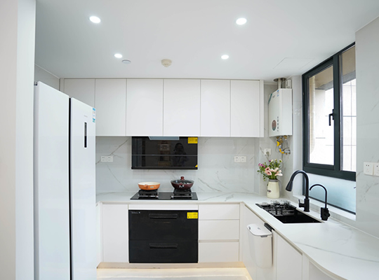 大面積的淺色瓷磚確保了廚房油煙能夠得到更好的清理,而懸掛式櫥柜的存在則有效提升了空間利用率。