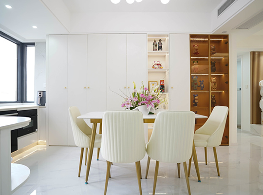 淡藍色的墻面為就餐區(qū)域增添了一抹清新明麗的氛圍,而造型優(yōu)雅的餐座椅則讓整個就餐區(qū)域多了一抹精致的浪漫感。