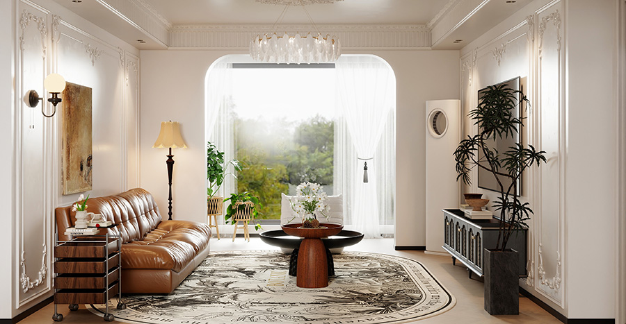 淺藍色墻面搭配上簡約的風景畫,一種悠然自得的清新感流淌在空間。而柔軟的深灰色絲絨沙發(fā),則為空間增添了品質(zhì)格調(diào)。