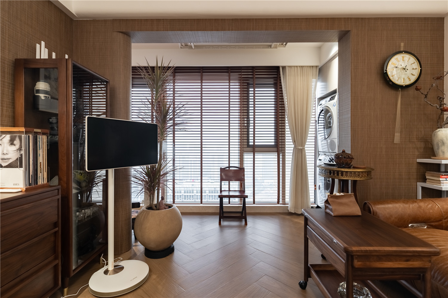 百瑞景這套三居室的住宅占地面積約為90㎡,戶型結構緊湊且空間浪費少,整體需進行改動的區域并不多,且能夠滿足業主的日常使用需求,因此設計師保留了原有的空間結構。為提升空間的利用率,提高業主生活品質,設計師將狹長的客廳中切割出一小塊區域打造成迷你衣帽間,在不破壞會客區域功能使用的同時,有效提升了整個空間的合理規劃性。