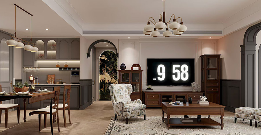 這是一套位于百瑞景的180㎡大戶四居室房屋,房屋面積雖然不小,但是由于家庭成員較多,因此在進行規劃設計時就需要充分考慮起居使用需求,在滿足各家庭成員使用需求的前提下再追求美觀度。為了提升空間的利用率,廚房區域、就餐區域、客廳設置于同一直線上,且餐廳與客廳沒有做明顯的硬隔斷,讓空間盡顯自由舒展格調。