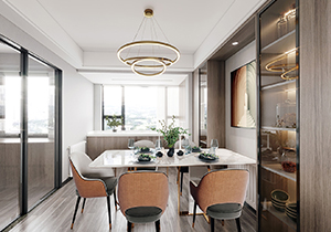 這是橡樹灣中一套160㎡的四居室,戶型面積中等,采光條件好,但內部分區較多,休憩區分區雜亂,需要設計出有邏輯的行動走線,這樣整體空間才具有設計感和時尚感。將餐廳與客廳中的非承重墻拆除,將兩個功能區合二為一,擴大了公共區域面積,使日常走動更為方便,以過道為中心,南北各分布兩個休憩區,日常生活變得更為舒適。