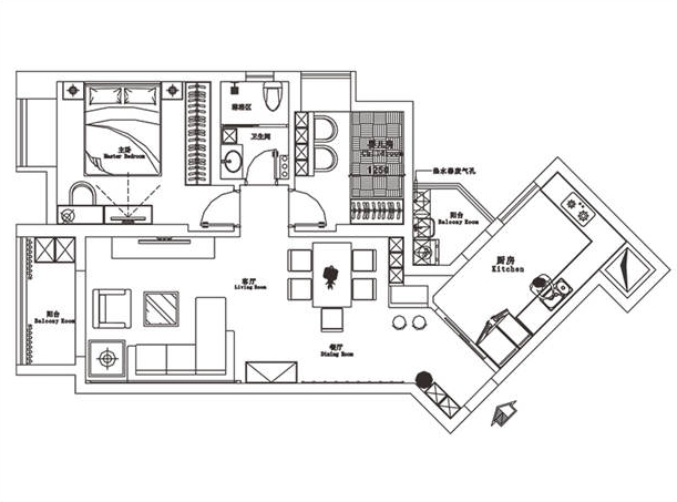 1、廚房改為開放式,與餐廳相連通,增設餐邊高柜與餐島一體設計,以補充廚房功能。