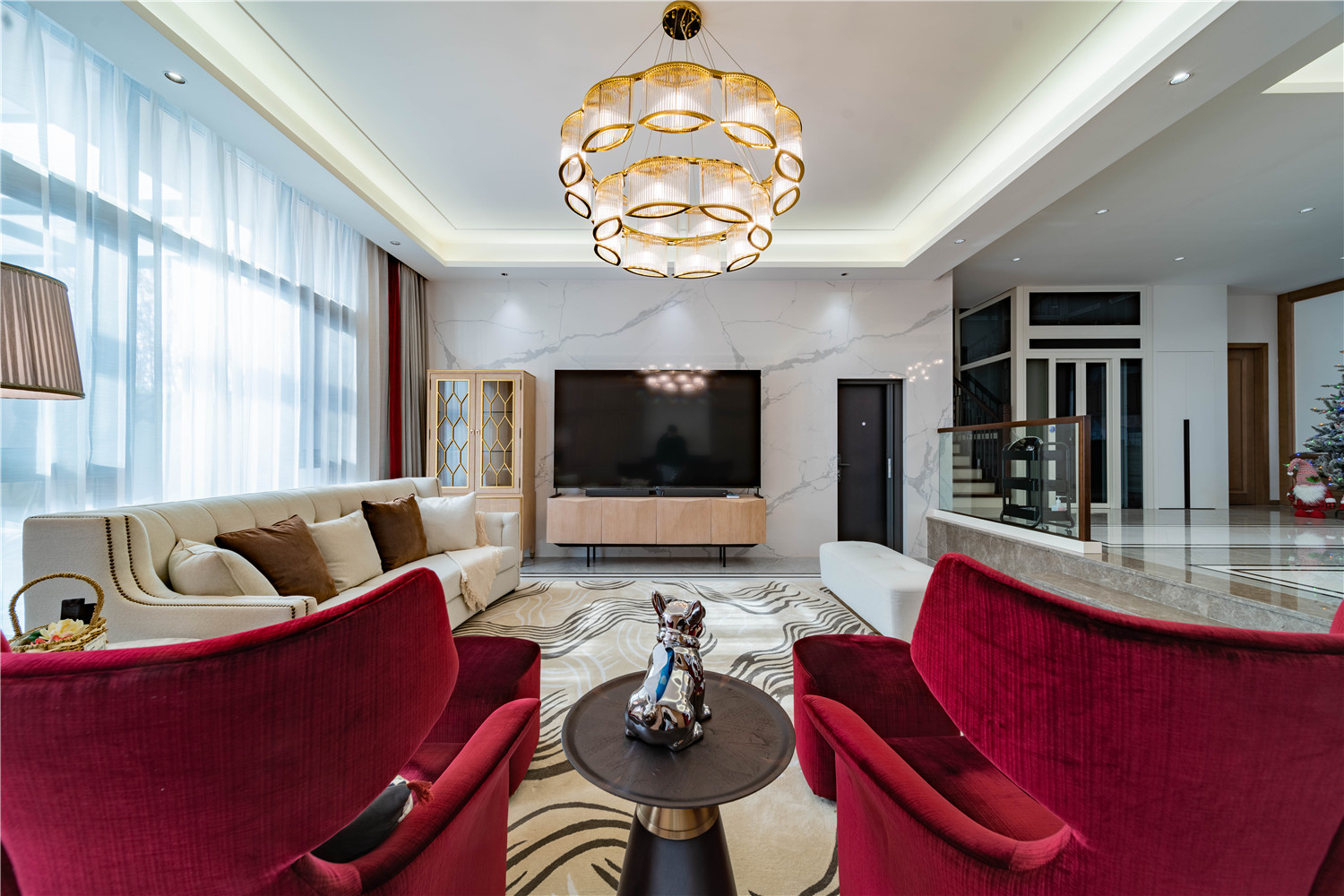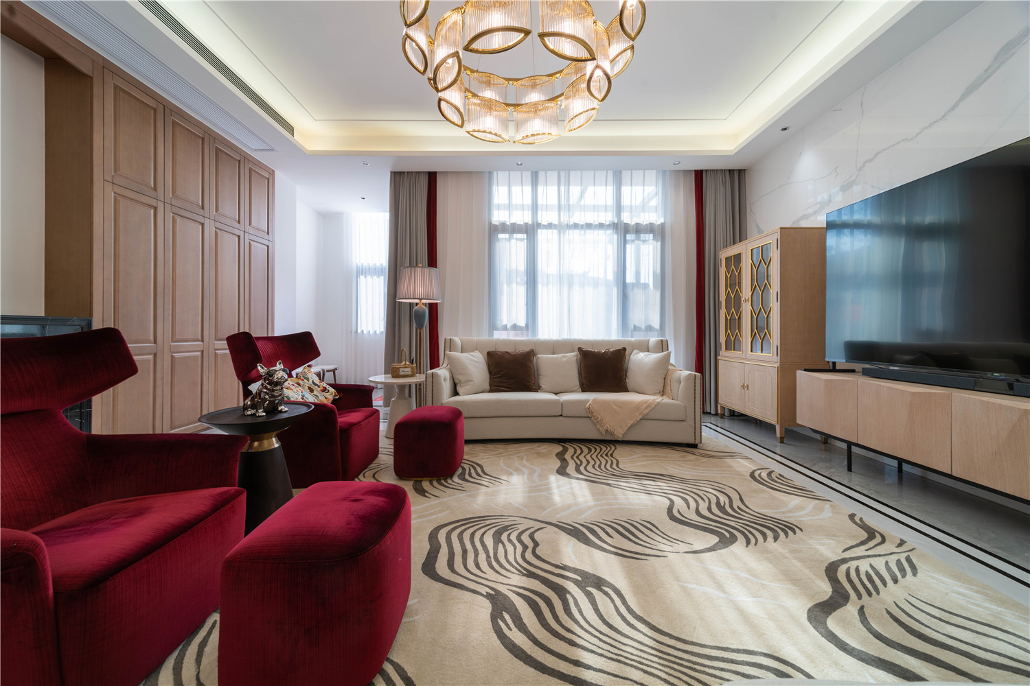 淡雅的奶油色在空間中悠然彌漫,輕柔地調和客廳的氛圍,使之更顯柔和與恬靜。墻面則巧妙地運用拼色設計,結合經典的法式雕花與流暢線條,勾勒出豐富而獨具匠心的紋理與層次,為整個空間增添了一抹優雅與精致的氣息。