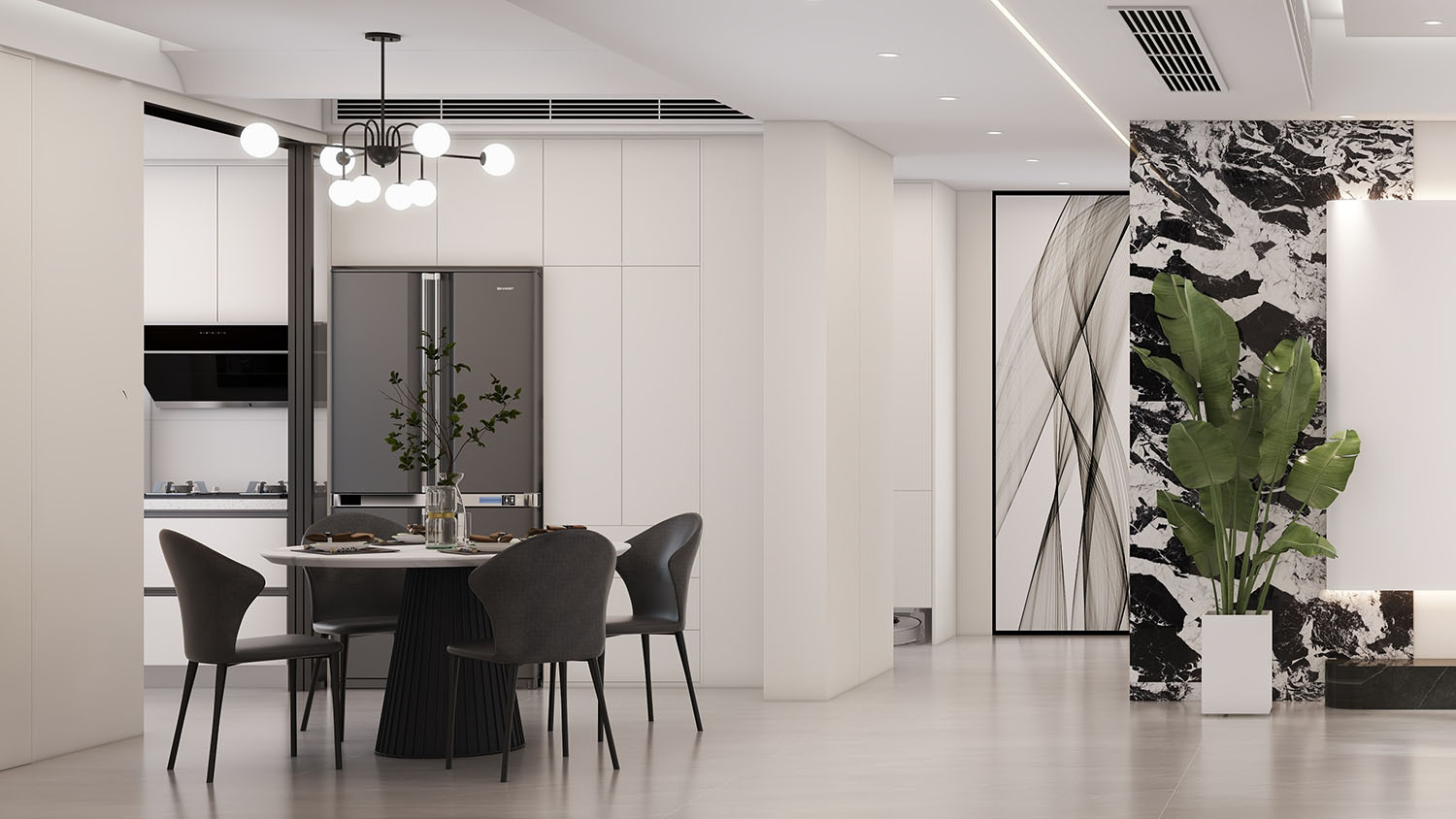 餐桌的另一側,矗立著真正的餐邊柜。白色柜體融合黑玻酒柜,黑白之間,有藏有露,盡顯簡約而不失格調的生活美學,實用與美觀并存。