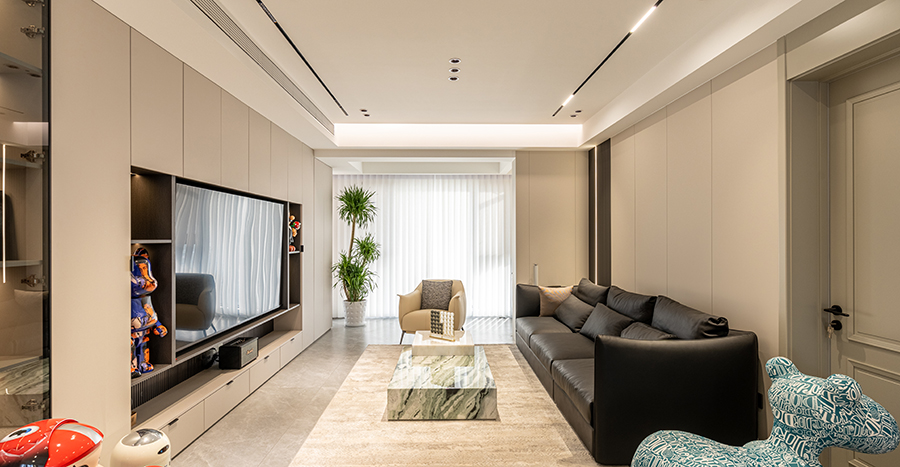 大面積的大理石瓷磚奠定了清冷通透的空間氛圍,搭配以質(zhì)感溫潤的木材,有效提升了空間的視覺平衡感。