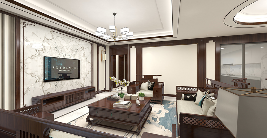 簡(jiǎn)約木質(zhì)仿古家具與現(xiàn)代時(shí)尚感濃烈的大理石背景墻之間的碰撞,呈現(xiàn)了宜古宜今的獨(dú)特時(shí)尚美。
