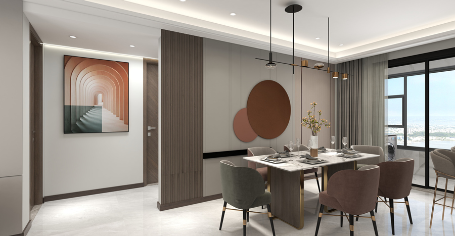 就餐區(qū)域配色清新又柔和,木色與白色之間的組合營(yíng)造空間溫馨靜謐感,墻面圓形藝術(shù)掛件簡(jiǎn)約清新而又不失藝術(shù)感。