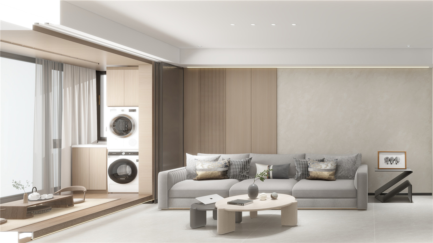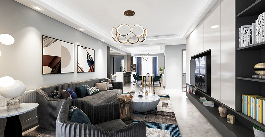 客廳以低飽和度的家具裝飾為主,設計師選擇了比較精致的沙發和地毯,同時在搭配上流利的裝飾畫,突出了客廳的簡約與精致;電視墻的設計以功能性為主,黑白二色的相互融入,令室內變得更加高級。