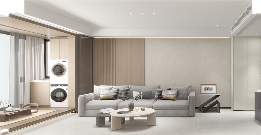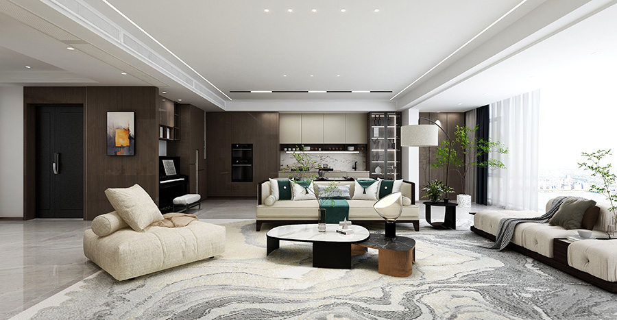 客廳空間利用溫潤的家具搭配水墨畫背景,展現出東方的禪意之美,傳達出舒適素雅的格調;沙發、茶幾、燈具、地毯等家具裝飾,既彰顯了中式的儒雅,又滿足現代生活的生活需求。