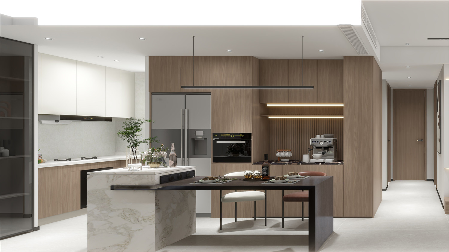 案例介紹:本案以簡化整合,改變后的空間呈上升之勢,置身其中給人積極向上之感,表現業主對快樂人生的追求;設計采用吧臺把門廳與餐廳兩個空間加以適當區分,形成一個隔而不斷,分而不離的互動空間,愜意的、時尚的、成功人士的品質生活體驗盡在其中。