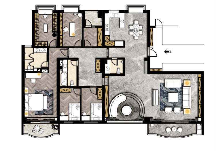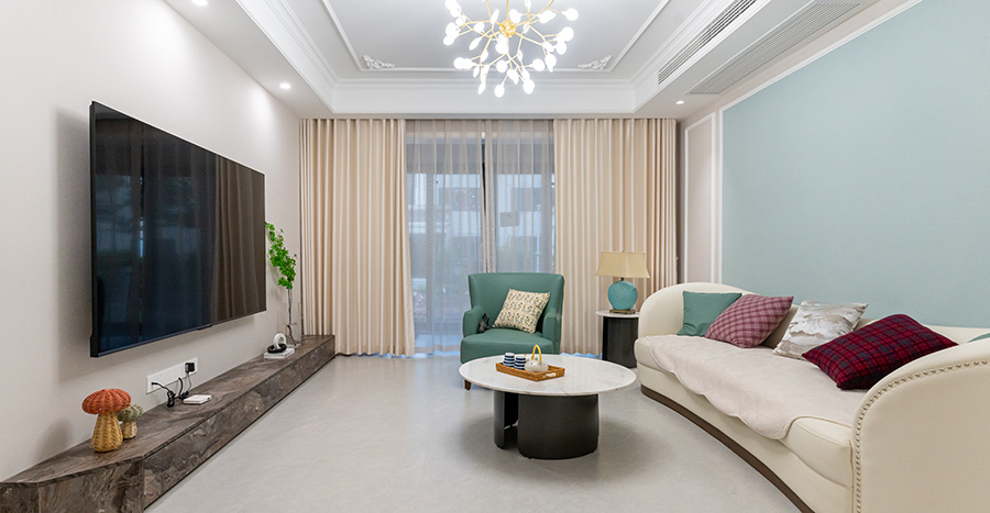 案例簡介:本案例房屋的常住人口除了業(yè)主夫婦二人之外還有一雙兒女,因此希望設(shè)計師能夠打造出一定的親子互動空間,確保孩子能夠健康快樂的成長。設(shè)計師考慮到業(yè)主家人的起居使用需求,將空間進(jìn)行了一定的再規(guī)劃,除了主臥之外單獨(dú)再分割出兩個迷你的臥室,滿足孩子們的日常曲劇需求。同時為了滿足業(yè)主在家辦公需求、會客需求,設(shè)計師將其中一個區(qū)域改造成書房,另外一個小空間中則設(shè)計成茶室。