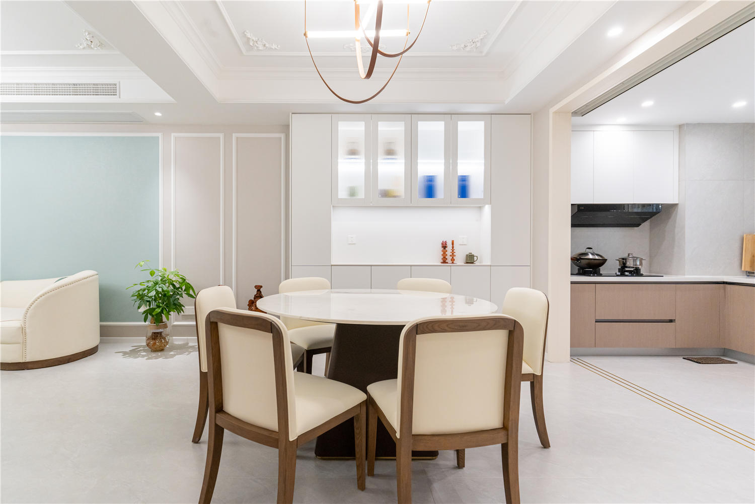 半開放式的廚房突出空間通透感,黑白經(jīng)典配色耐看又時尚。