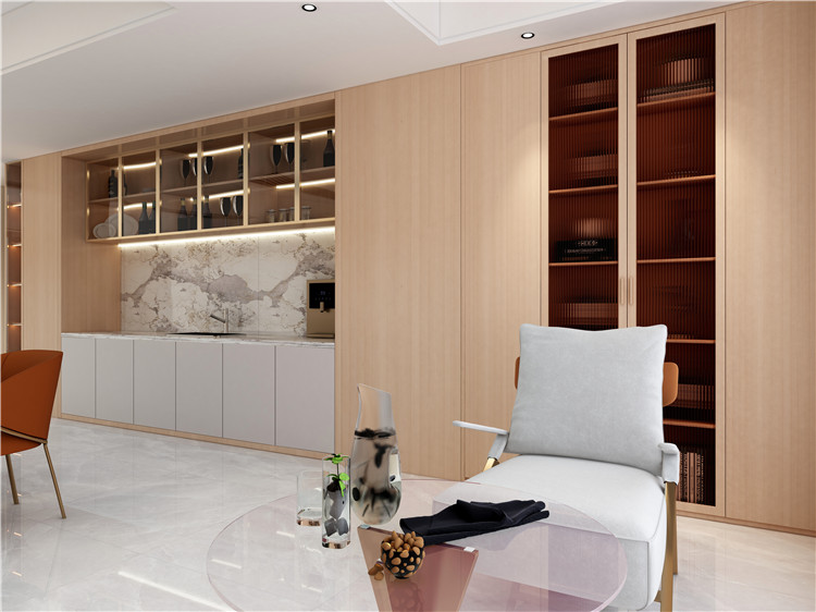就餐區(qū)域沿用了與客廳一致的燈光與配色,以保障整個(gè)家居空間具有一定銜接感。而餐廳與客廳的隔斷選用了玻璃推拉門設(shè)計(jì),在保障就餐區(qū)域擁有足夠透明的同時(shí),還避免還區(qū)域顯得過于獨(dú)立,缺乏空間整體和諧感。