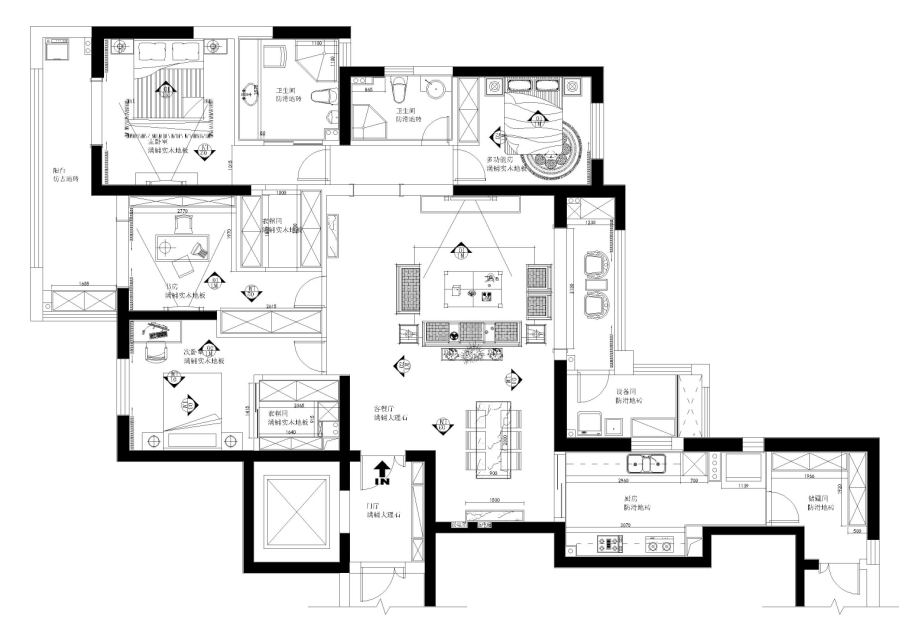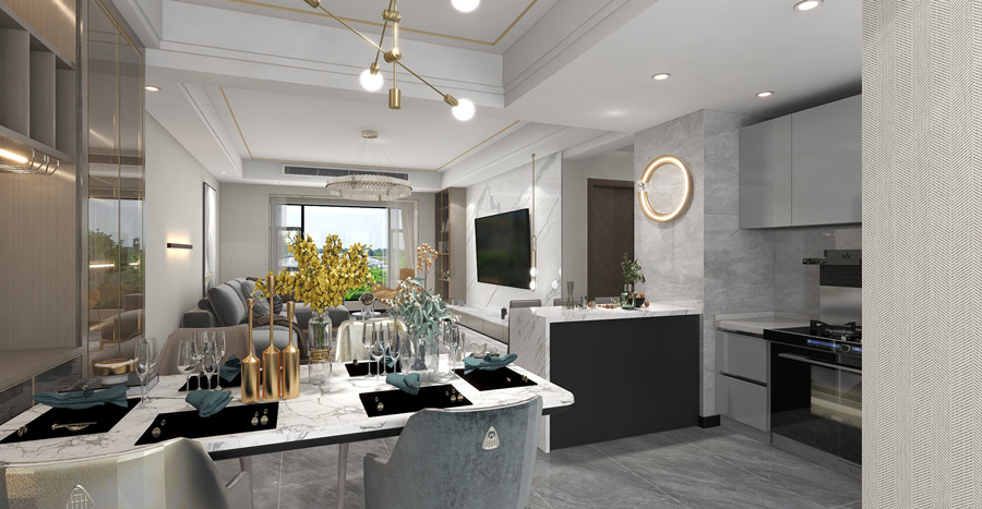 這套位于綠地金融國際城的四居室房屋面積雖然在220㎡左右,但是由于戶型并不方正平整,且存在著零碎角落,因此存在著較大的設計難題。為了讓所有的空間都得到合理的充分利用,化解戶型缺陷,設計師對空間進行了再規劃,將入戶處左邊的狹長條區域打造成廚房,利用戶型的轉折減少油煙進入生活空間的概率。同時將該區域進行一定的再切割,規劃出一塊置物空間,有效提升了家居空間的利用率。