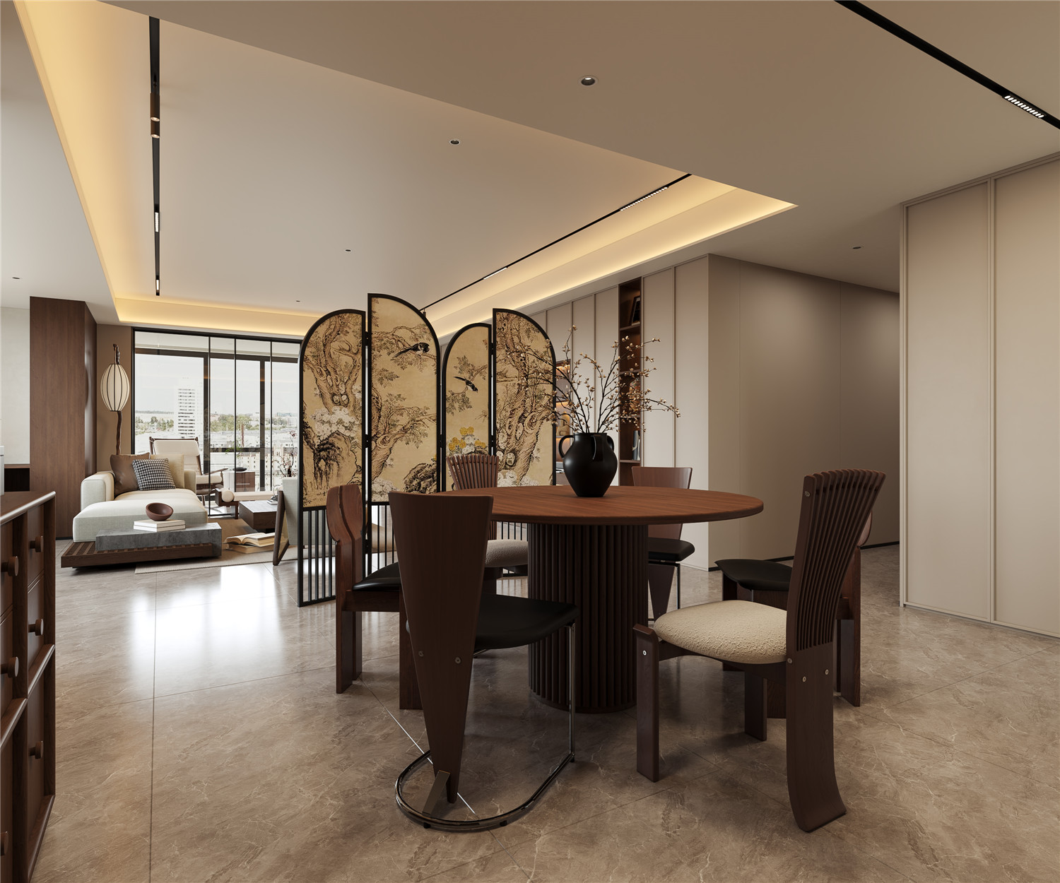 方正的餐廳搭配了奶茶色現代的桌椅,墻上的掛畫看起來簡單卻具有獨特的藝術氣息。