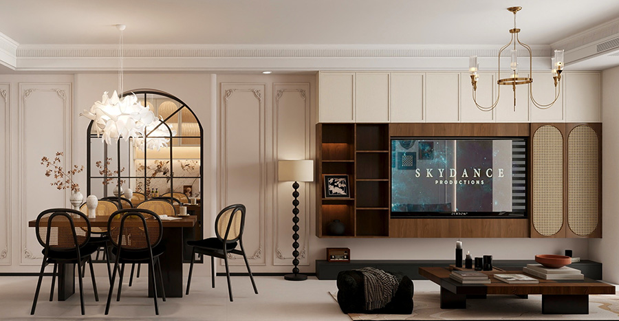 這是中興泰富一套137㎡的三居室住宅,戶型結構設計上將客房與主臥、次臥房分開設計,有效保障了主人生活空間的私密性。而主臥空間與次臥空間的部分過道則巧妙融入到主臥空間,以提升空間的利用率。餐廳區域與廚房區域使用軟隔斷進行分割,以保障整個空間不至于顯得過于閉塞、呆板。客廳區域與餐廳則使用地毯則為軟隔斷,以整個空間是視覺感官更加開闊。