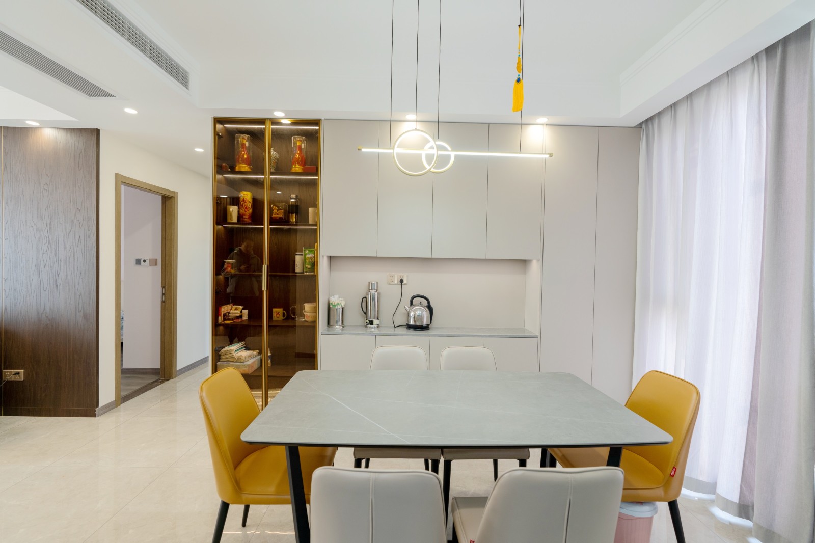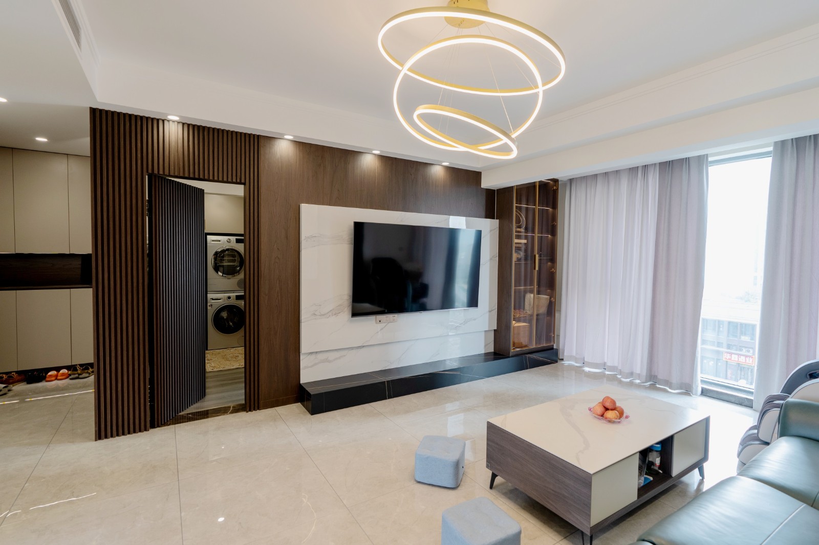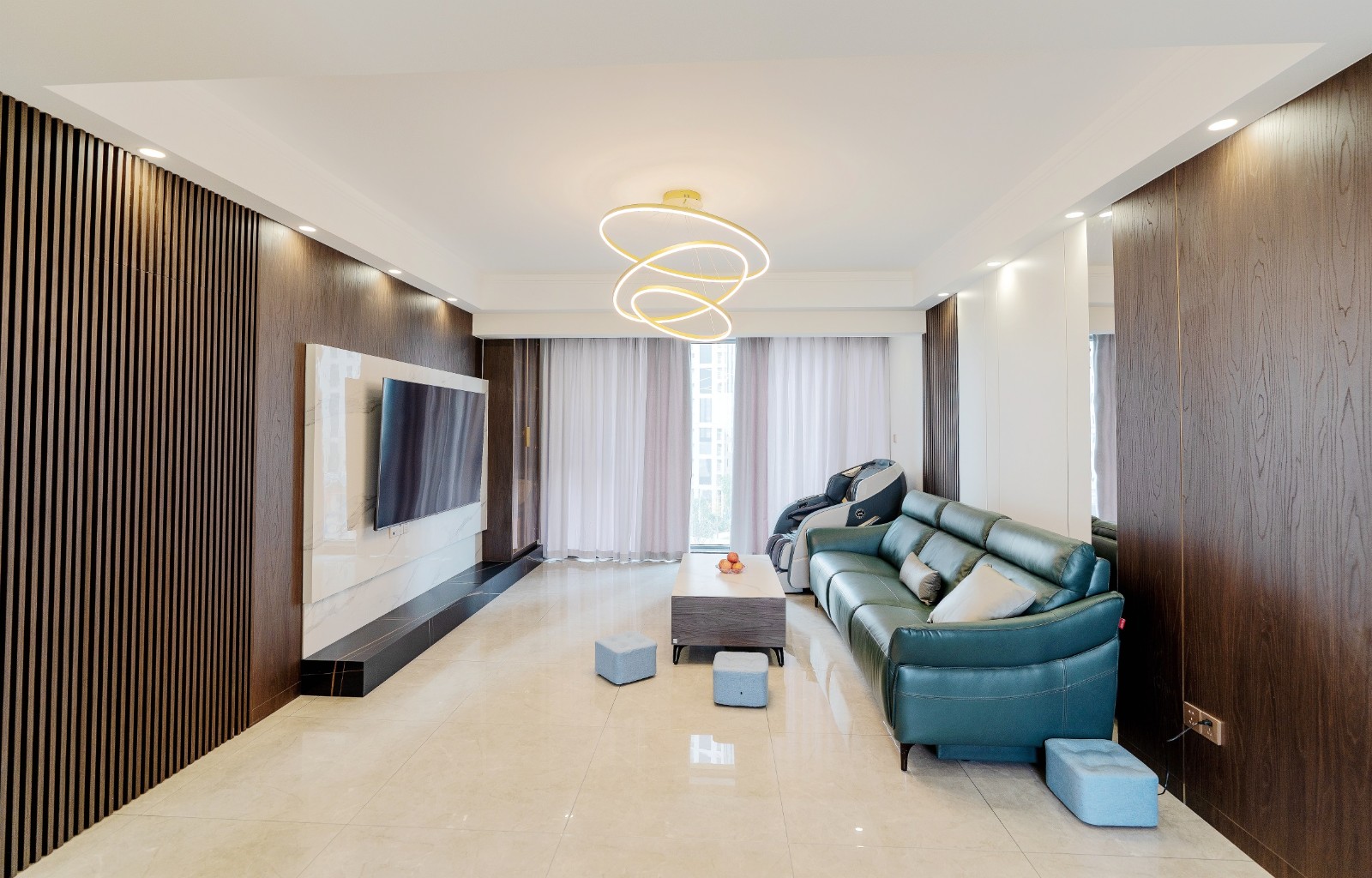 這套融創(chuàng)觀瀾府的四居室房屋建筑面積在143㎡左右,房屋的結構已經(jīng)有了雛形,且業(yè)主為了節(jié)約裝修花銷,提議設計師在原有的戶型結構上進行裝修設計。因此設計師保留了原有的功能結構,同時借助色彩、材質等軟裝元素為房屋進行“包裝”,以保障裝修效果。同時,為提升空間質感,設計師選用了大量“隱形”設計,如材質本身的紋理等,以起到在無形中裝飾空間的作用。