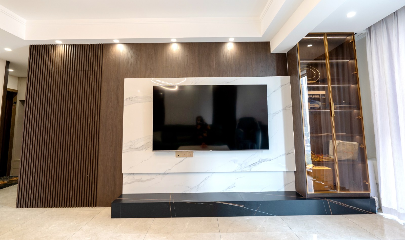 借用隱形門作為電視背景墻,藝術感十足而又有效提升了藝術墻面的利用度。