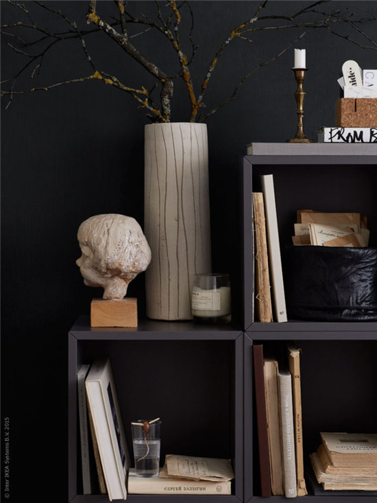 ▲如果所有物品都呈相似高度或按照從低到高有規律地陳列,未免顯得過于刻板。那么我們就要有意識地制造高低落差,把高的物品放在矮的物品旁邊,這種變化會帶來獨特的視覺節奏。也可以利用累起來的書本或置物架本身的結構來制造落差。
