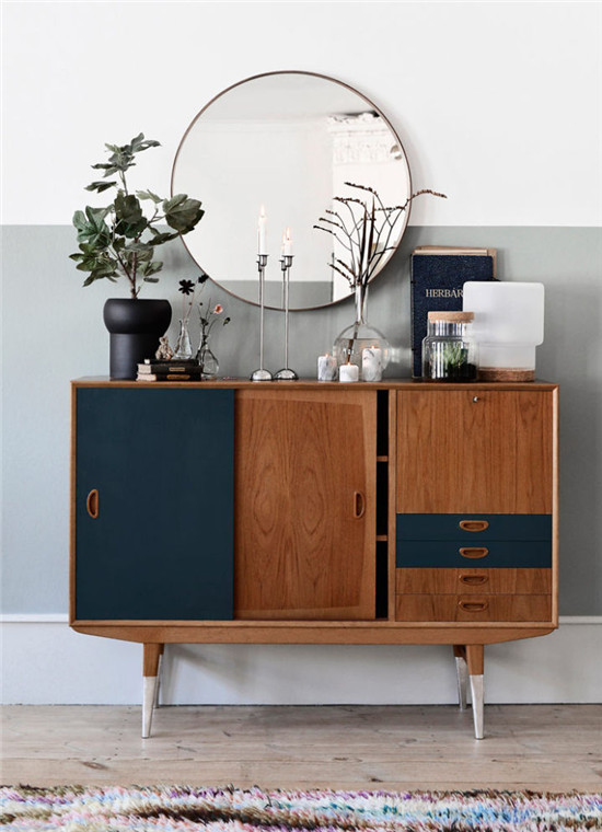 ▲除了常見的框畫,墻上還可以掛上形態各異的鏡子,尤其是圓鏡和方柜之間能碰撞出強烈的幾何美感。