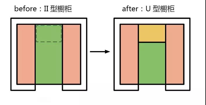 可見「U」型櫥柜在節(jié)省面積方面有壓倒性的優(yōu)勢,其次就是「II」型櫥柜。