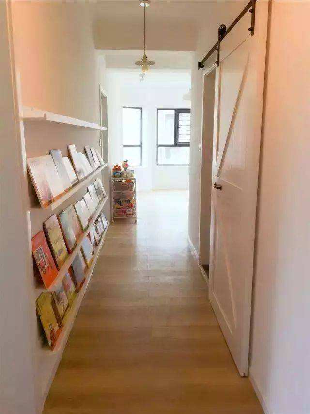 將走廊設(shè)計成美觀實用的書墻,既充當(dāng)了區(qū)域的屏風(fēng),又充當(dāng)了書本的收納區(qū),書籍在上側(cè)的擱架上被穩(wěn)穩(wěn)疊起,十分服帖,而這種設(shè)計,實則又是一種背景墻裝飾。
