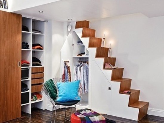 房價(jià)飆升年代,許多人會(huì)選擇LOFT挑高小戶型(層高3.6-5.2米左右),分隔成兩層使用。而LOFT樓梯下的小空間,放雜物太過可惜,它可是絕佳的改造位置。使用金屬網(wǎng)、收納架、抽屜柜和布簾等,就能擁有一個(gè)別有洞天的衣帽間!
