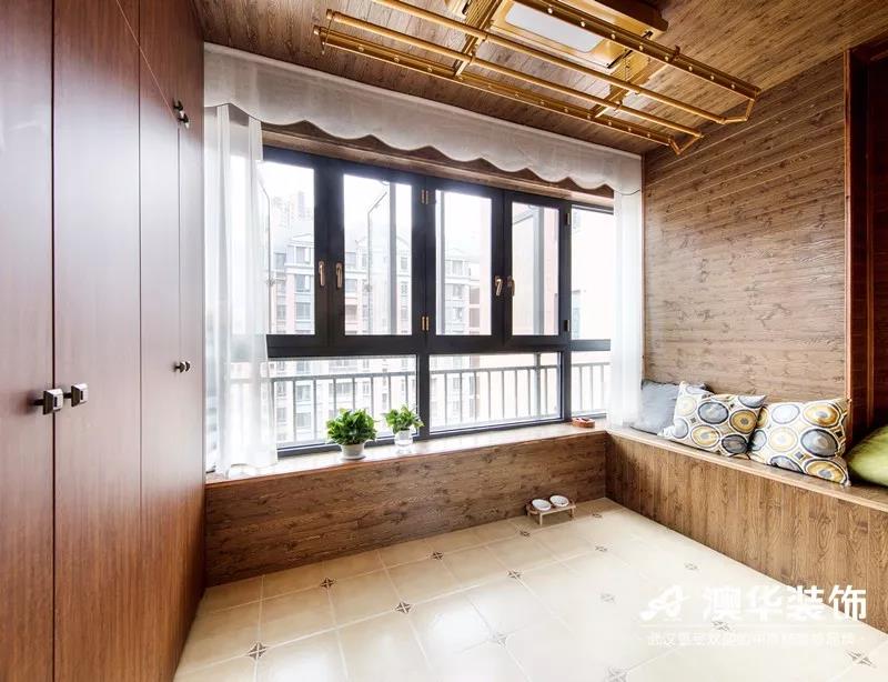 陽臺墻面和頂面采用杉木板做染色漆,偏美式田園風的陽臺,一個愜意的陽光午后,沏一杯清茶,這就是最幸福的時刻。