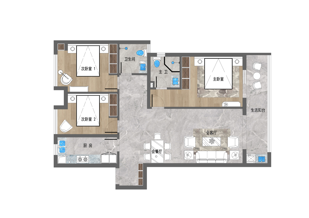 1 通過減小次衛,和主臥更衣區面積,解決靠近主臥的次臥空間不足衣柜不便安置的問題。