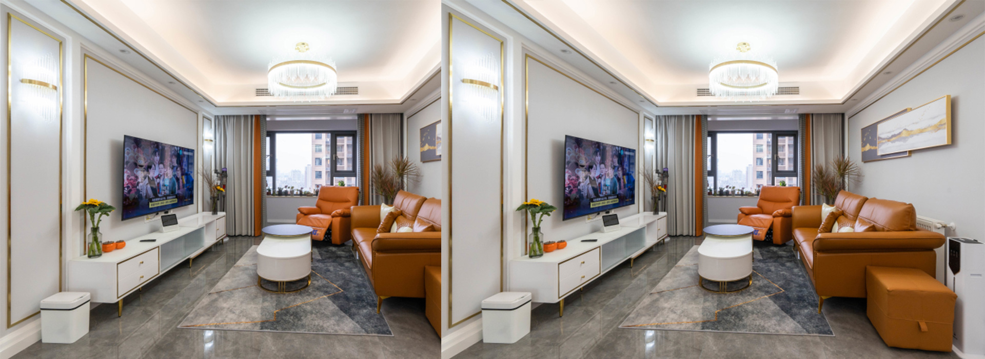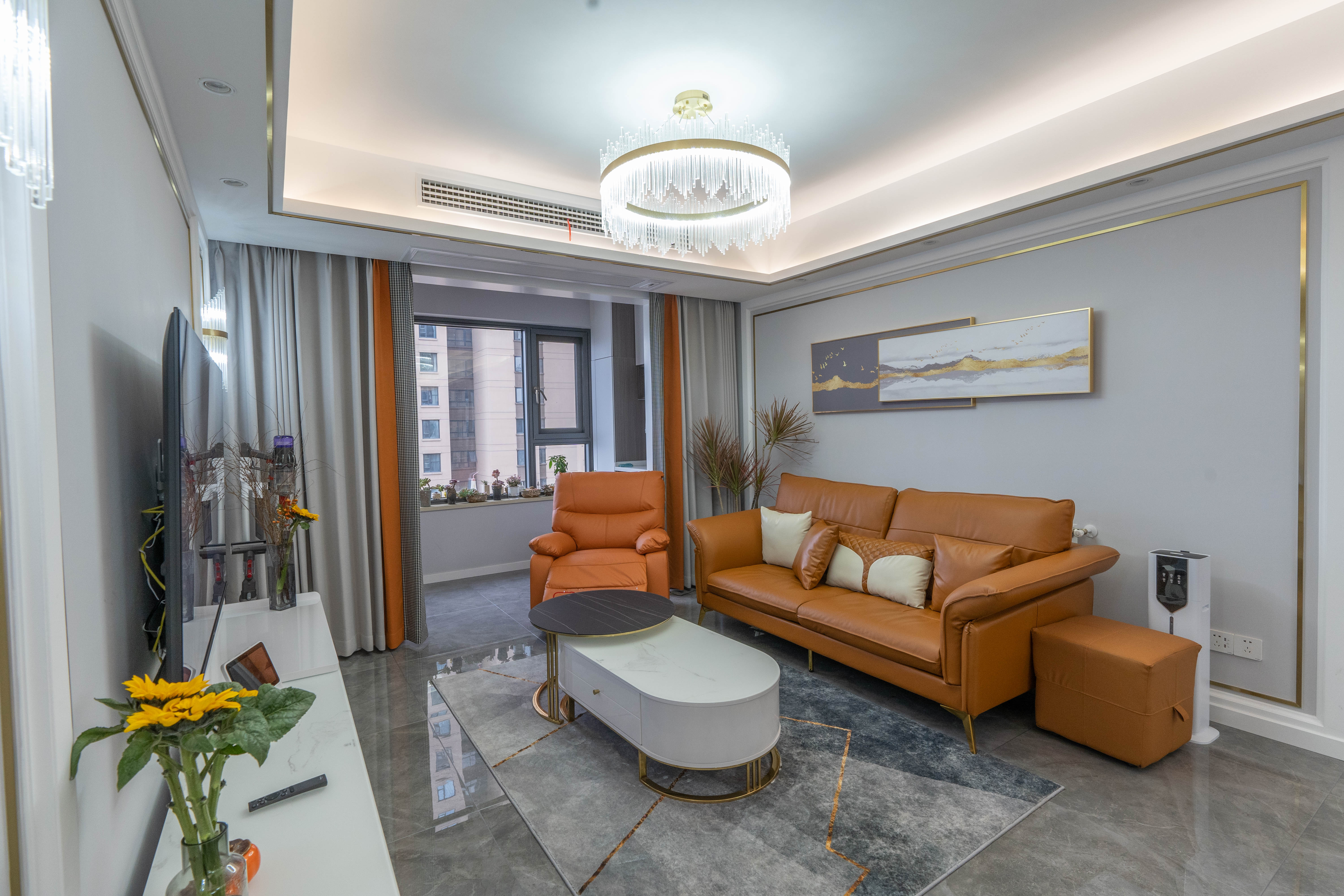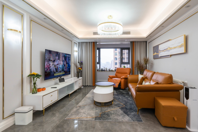 • 沙發背景墻這塊以白色木飾面與金屬線條鑲邊,搭上拼接的風景畫,簡簡單單的配置,既裝點了空間,又呈現出低調的奢華。 沙發的愛馬仕橙配色,與窗簾的一抹橙色相呼應,溫暖歡快,充滿活力與朝氣,非常符合業主熱情大方的性格,體現了其對生活的熱愛。