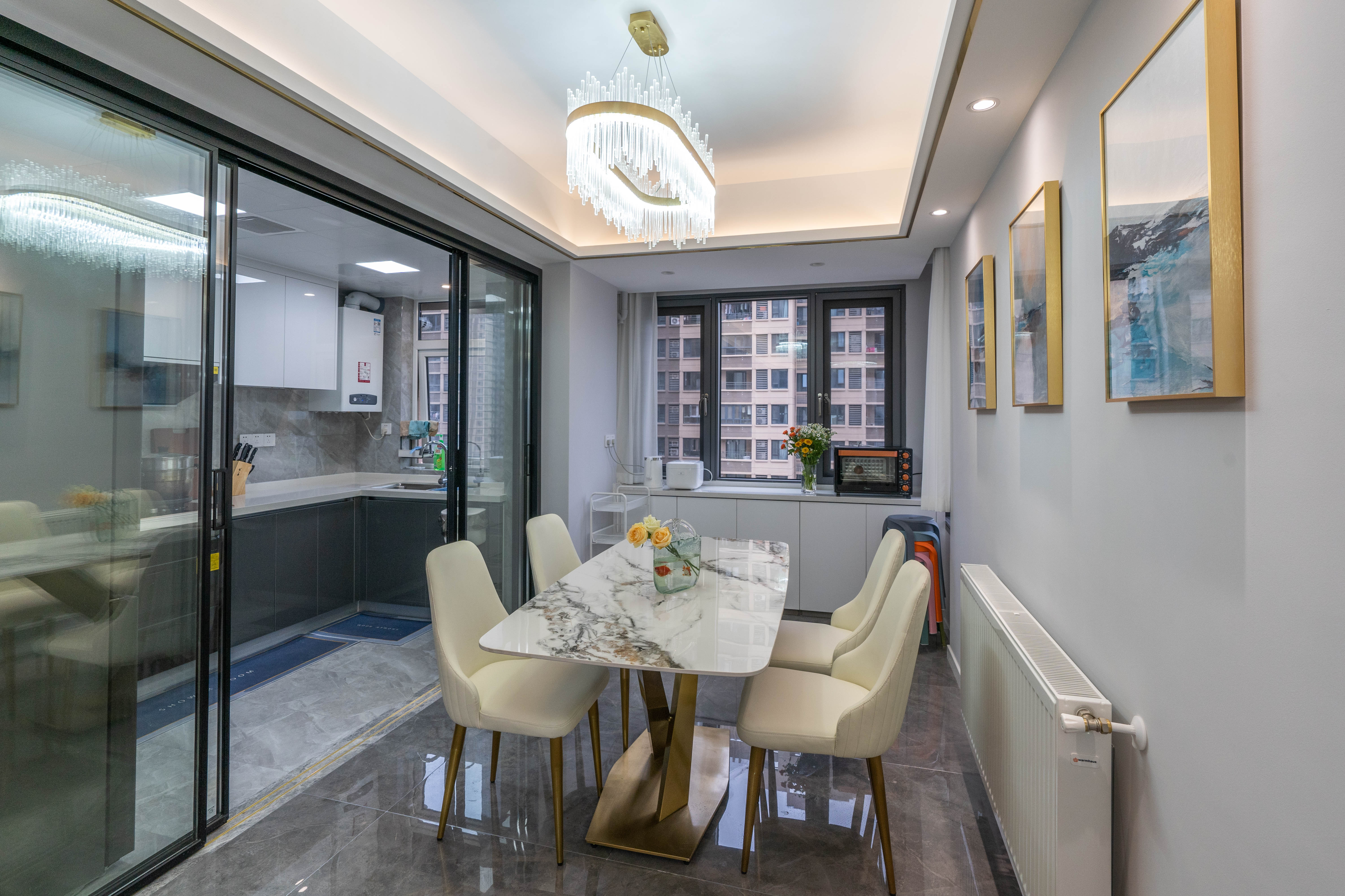 • 小金魚與鮮花的配置,一靜一動,相得益彰,使得就餐時更加有趣味。再加上水晶燈柔和的燈光,氛圍感拉滿,在家就能體會約會時的美好浪漫時光。 餐廳陽臺朝北,利用率不高。這里選擇將陽臺并入餐廳,并沿窗戶增加整面餐邊柜作為櫥柜臺面的補充,非常的實用。