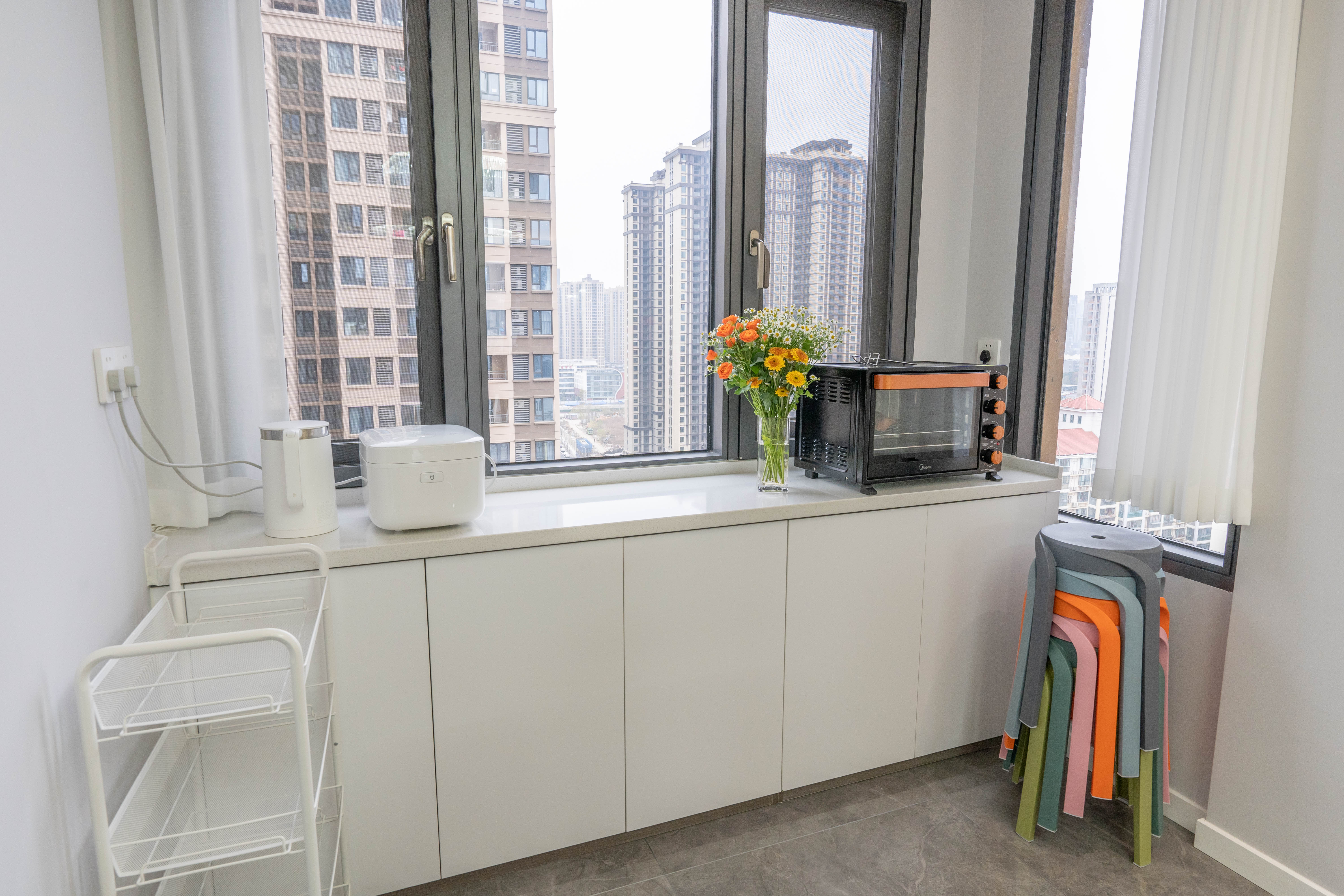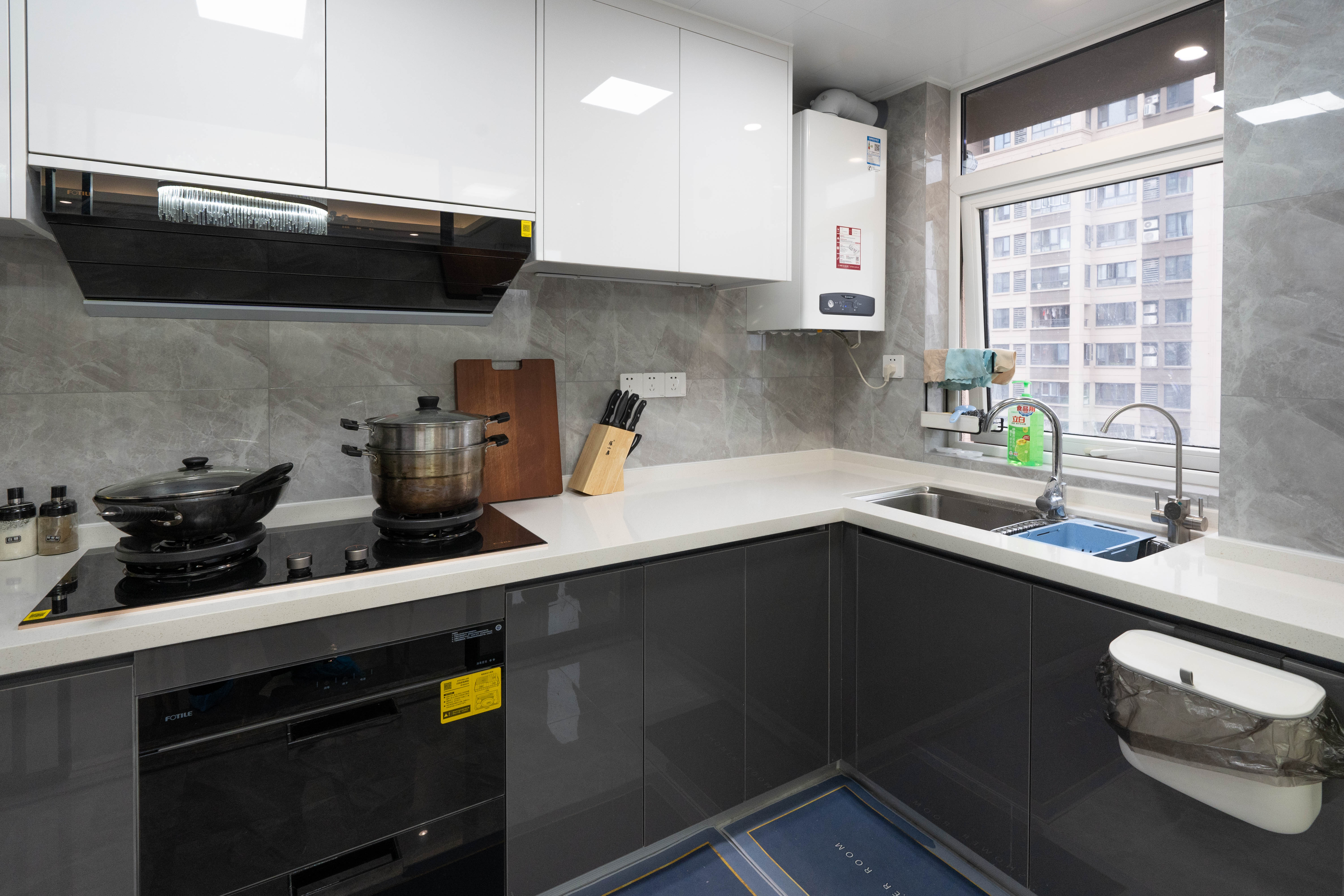 • 廚房面積不大,這里選用了U型的布局。廚房移門分成四扇,開口更大,采光更好,進出也非常方便。整體的配色以灰白為主,既有提亮空間的效果,又非常耐臟,方便業主清理。