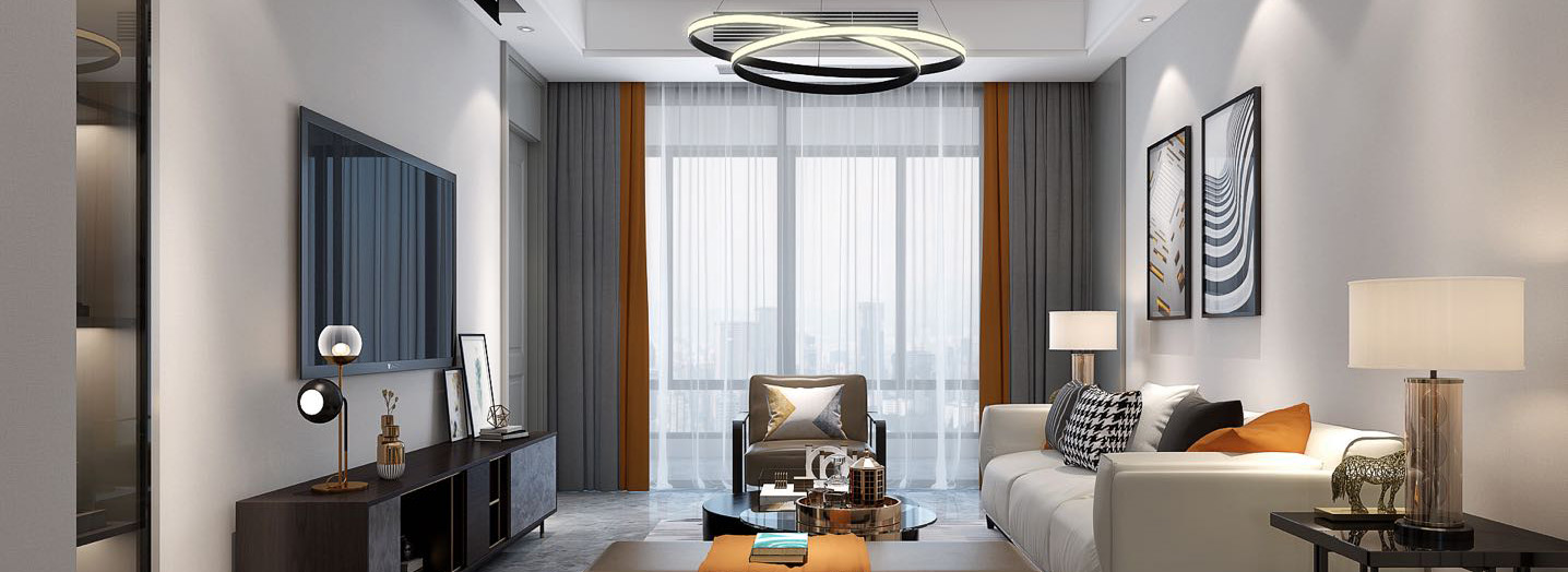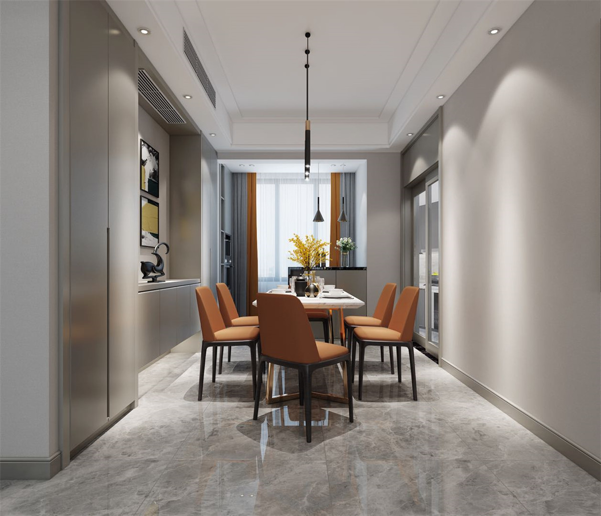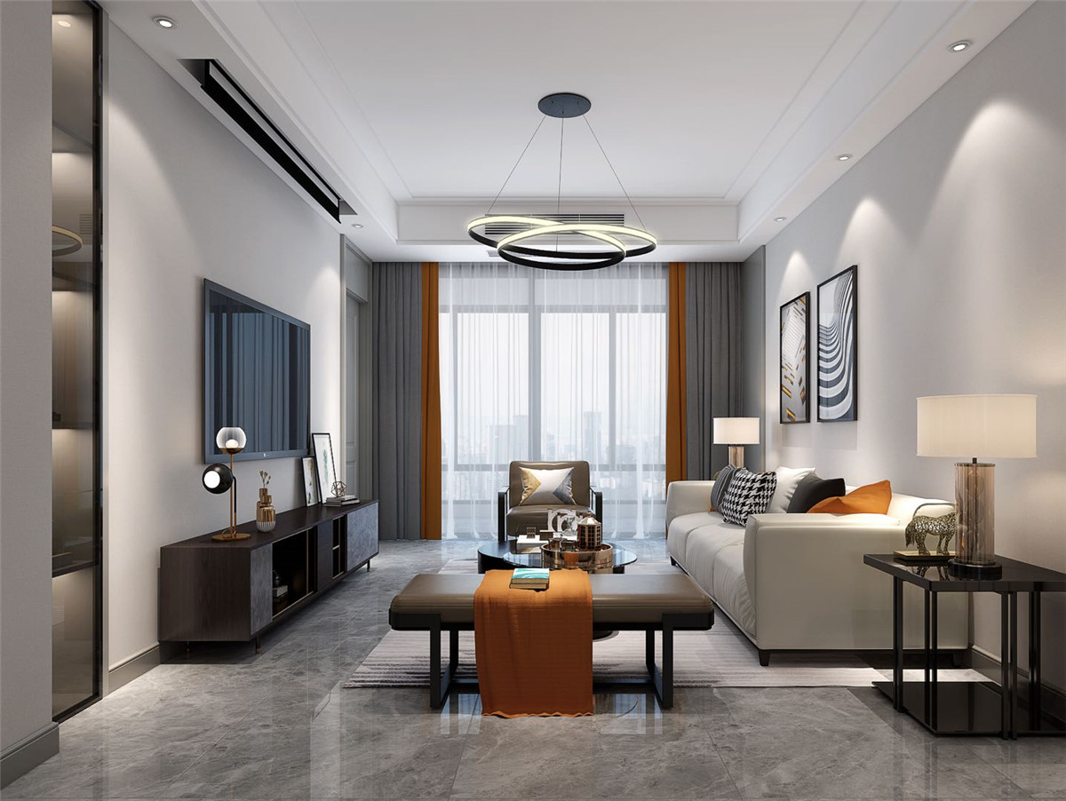 • 整體色調為灰白色,去除復雜的造型,力求簡潔明朗的感覺,軟裝配飾點綴暖橙色提高空間層次感