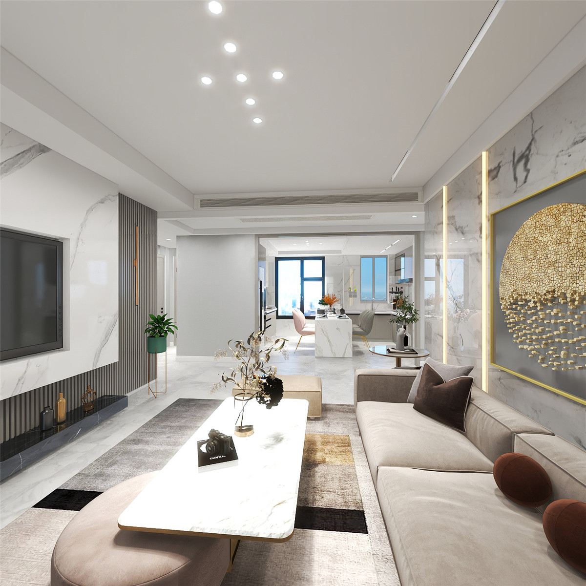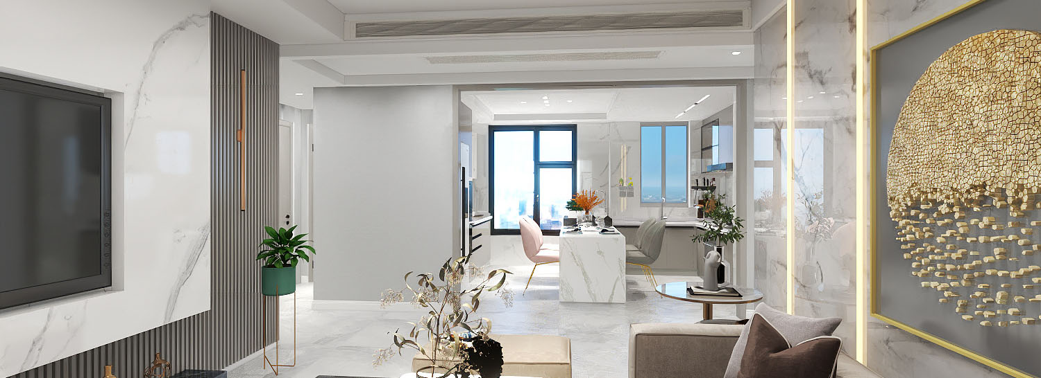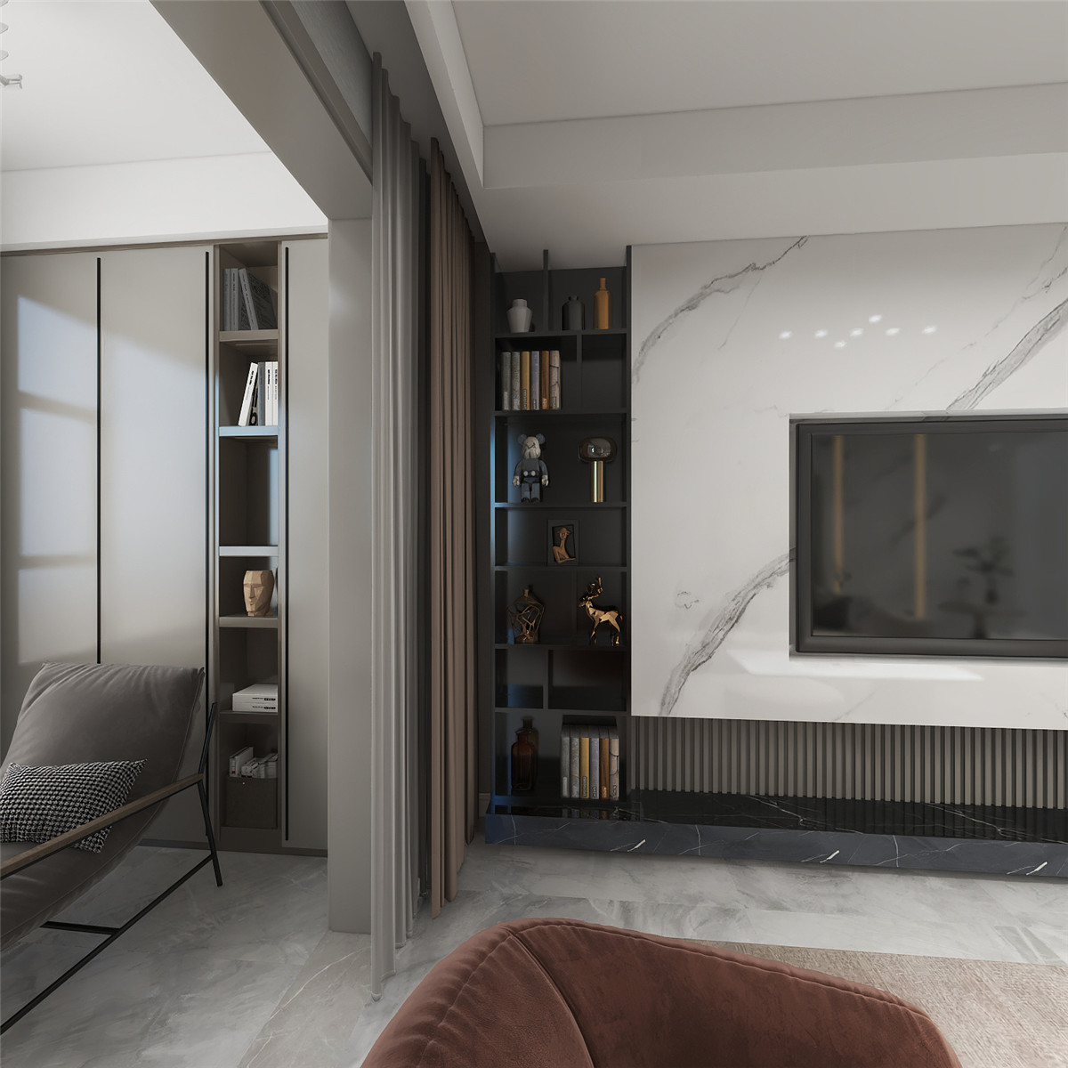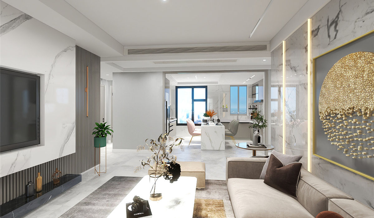 本案整體定位是輕奢風(fēng)格,客廳及公共區(qū)域用高級灰的瓷磚和巖板配上溫馨自然紋理的木質(zhì),細(xì)節(jié)以拉絲金線條點綴,讓居住空間提高檔次,臥室用低調(diào)輕奢之感,恰到好處地打造了溫和且充滿質(zhì)感的睡臥氛圍雅致與淡然.