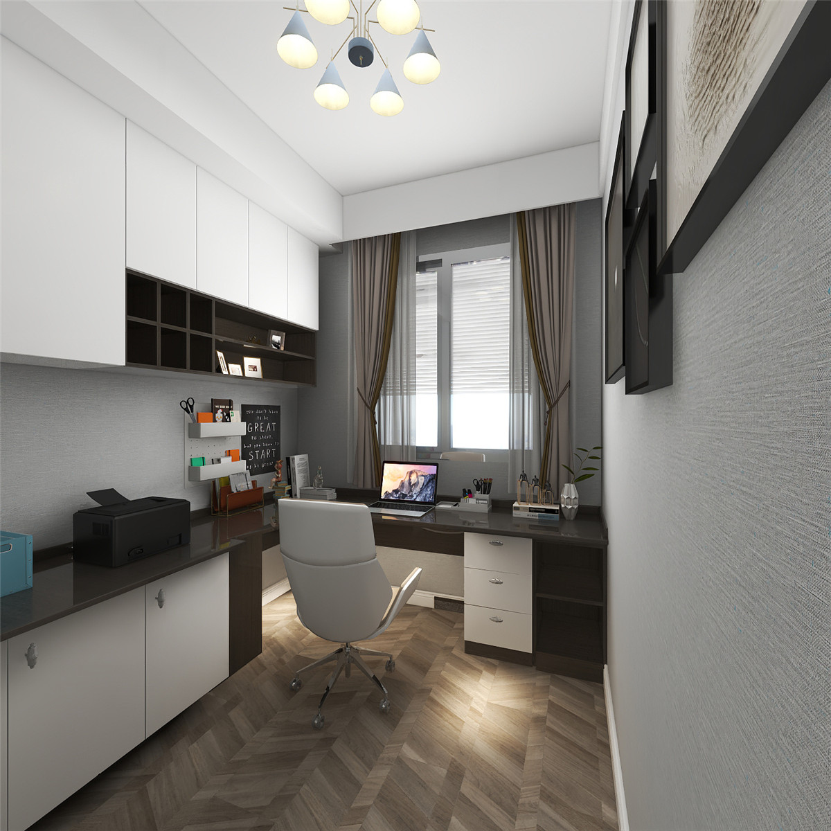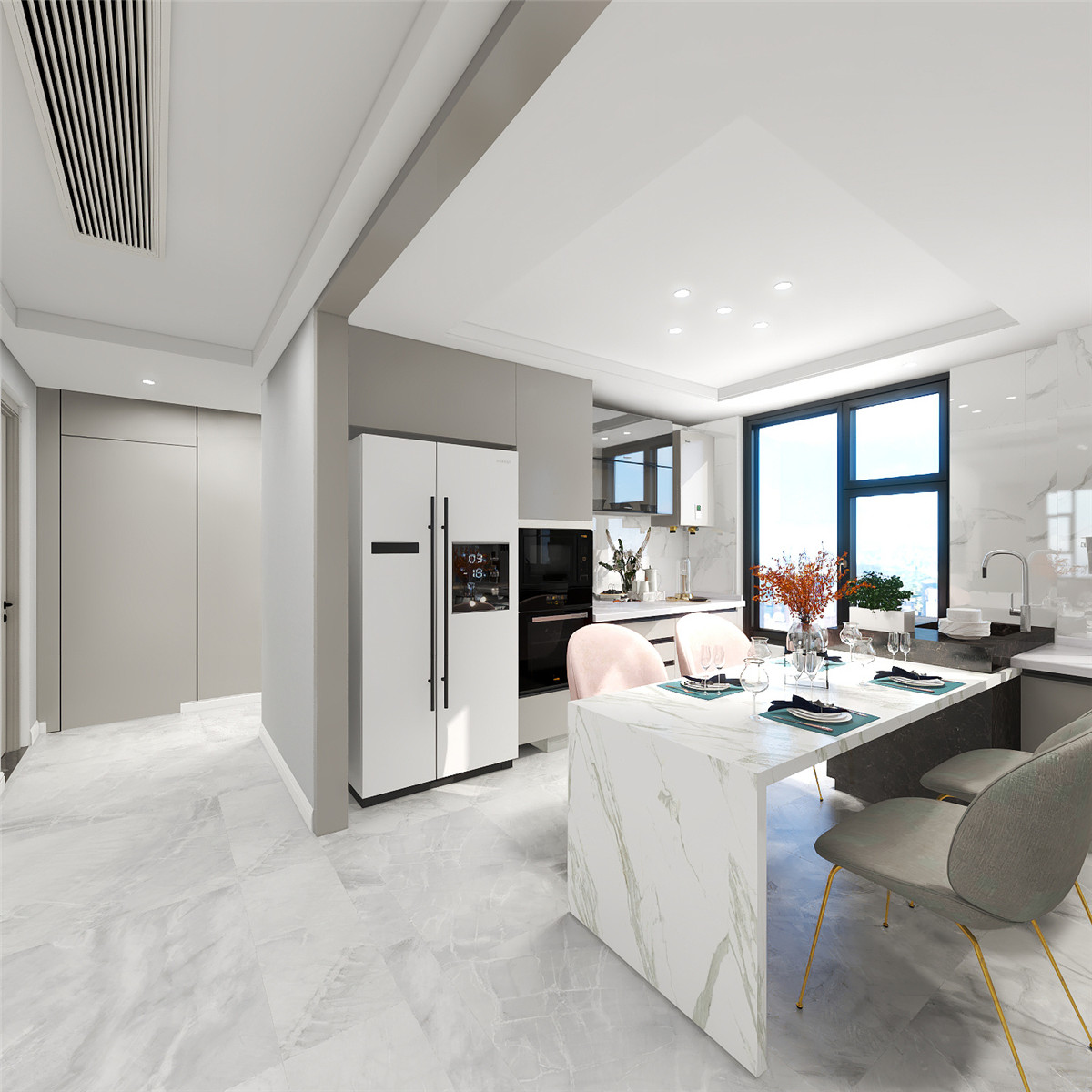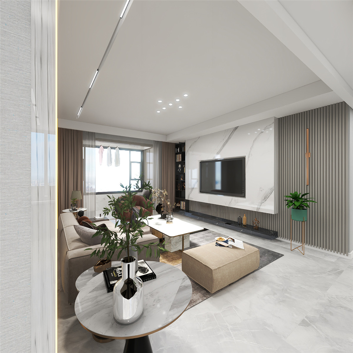 本案整體定位是輕奢風(fēng)格,客廳及公共區(qū)域用高級灰的瓷磚和巖板配上溫馨自然紋理的木質(zhì),細(xì)節(jié)以拉絲金線條點綴,讓居住空間提高檔次,臥室用低調(diào)輕奢之感,恰到好處地打造了溫和且充滿質(zhì)感的睡臥氛圍雅致與淡然.