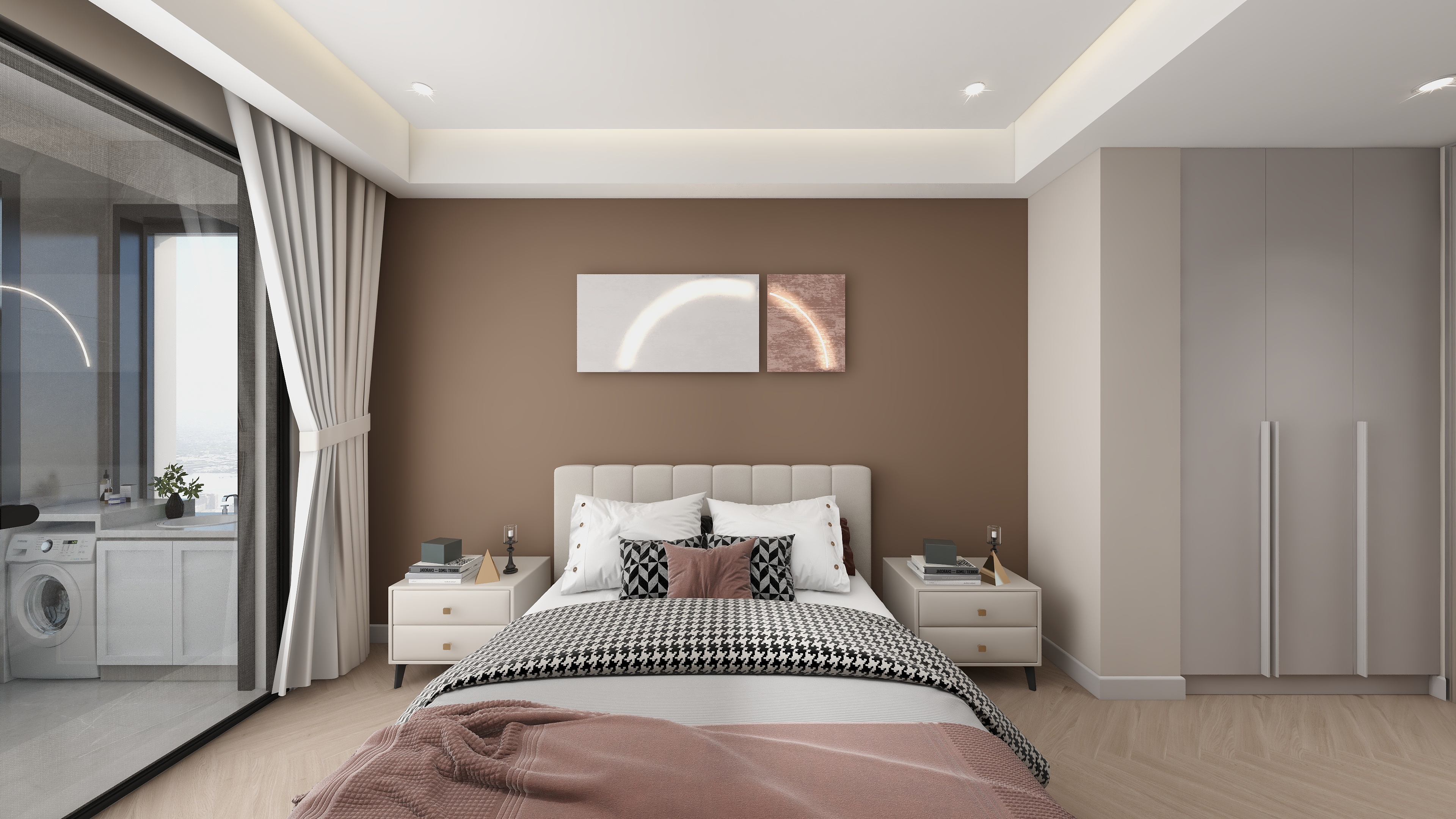 簡約的墻頂面造型處理,面飾藝術涂料增加肌理感,高飽和度的大面色彩營造舒適氛圍。